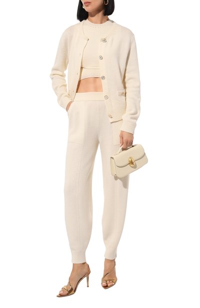 Асимметричный топ с удлиненными боковыми вставками может стать акцентом в образе. Модель с широкой драпирующейся горловиной связали из пряжи на основе хлопка, в которую вплели пайетки.