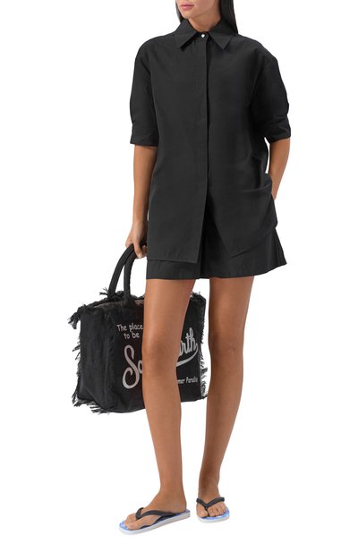 Рубашку из стрейчевого хлопкового поплина дополнили двумя нагрудными карманами и эластичной вставкой внизу. Сзади укороченную модель с супатной застежкой украсили фирменной накладкой в форме звезды.
