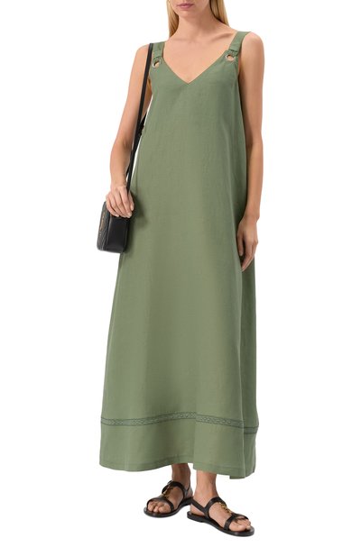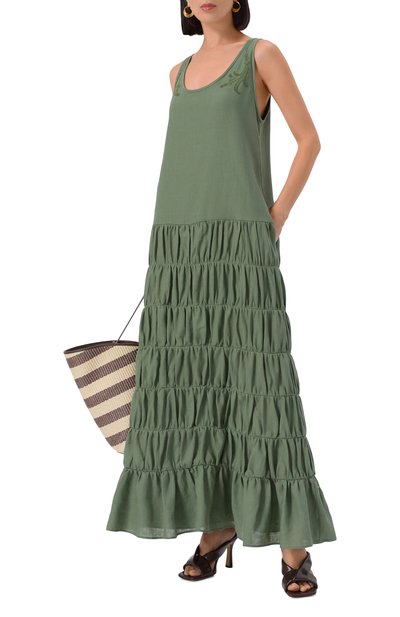 Макси-платье Michelle с широкими бретелями связали вручную крючком из мягкой шелковой пряжи. Модель с крупным цветочным узором дополнили высоким боковым разрезом.