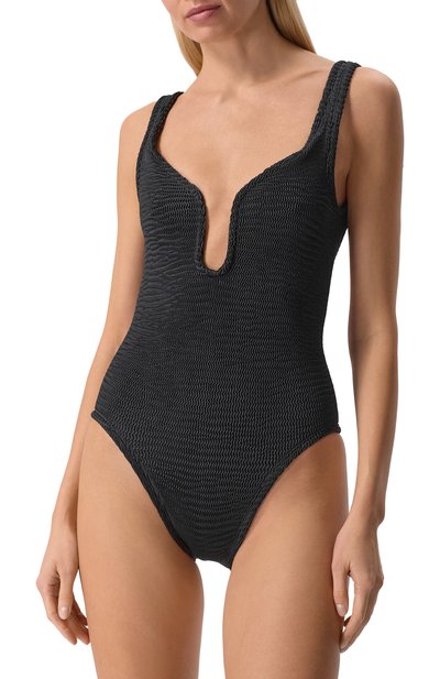 Для изготовления раздельного купальника Frida использовали эластичный гофрированный материал на основе нейлона. Плавки оставили без декора, бра дополнили U-образной застежкой-крючком, формирующей драпировки и фигурный вырез.