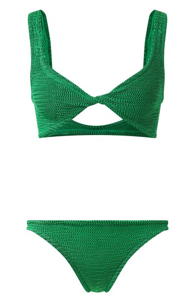 Раздельный купальник Donika с универсальным размером от XS до 2XL сшили из быстросохнущего гофрированного материала. Бра с широкими бретелями и поясом без застежки украсили спереди драпировкой-узлом.