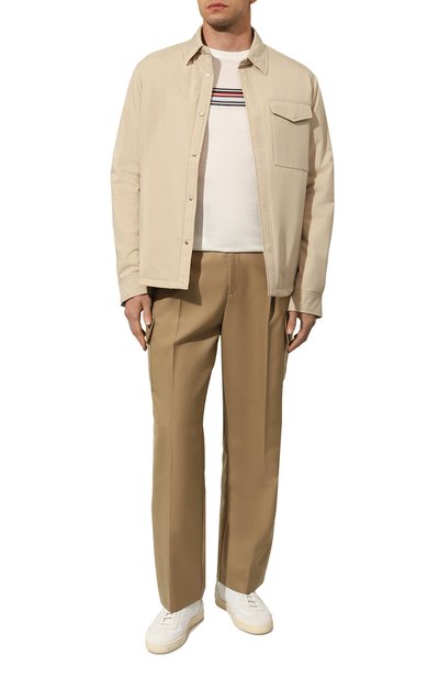 Футболку с однотонной каймой на горловине выполнили из хлопкового трикотажа с фирменным зигзагообразным узором. Предлагаем сочетать модель с повседневной одеждой нейтральной гаммы.