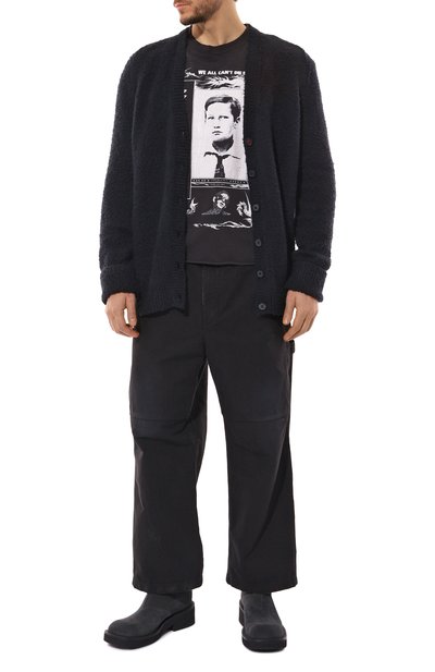 Кардиган с V-образным вырезом выполнили из тонкой шерсти. Модель с бархатистыми вставками–заплатами на локтях декорировали на спинке четырьмя фирменными белыми стежками.
