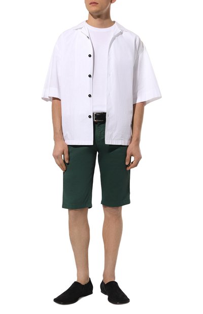 Шорты с высокой посадкой и съемным поясом с пряжкой сшиты из эластичного хлопка. Модель с двумя врезными карманами и парой крупных накладных дополнена широкими отворотами.