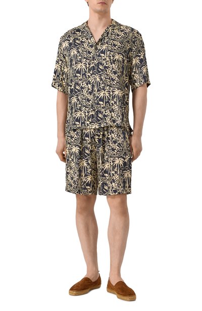 Свободную рубашку с короткими рукавами и отложным воротником выполнили из вискозного твила с добавлением тенселя. Принт с рисунками, напоминающими наброски углем, создает иллюзию, что модель сшита в технике петчворк.