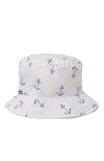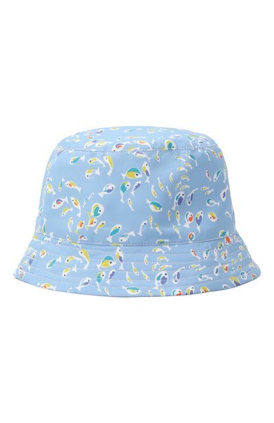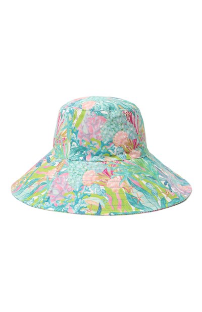 Панаму с широкими полями сшили из хлопка с цветочным паттерном. Тулью аксессуара с шестью клиньями украсили объемным бантом.