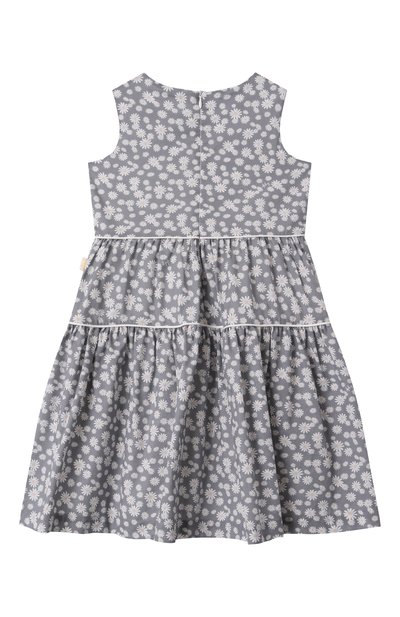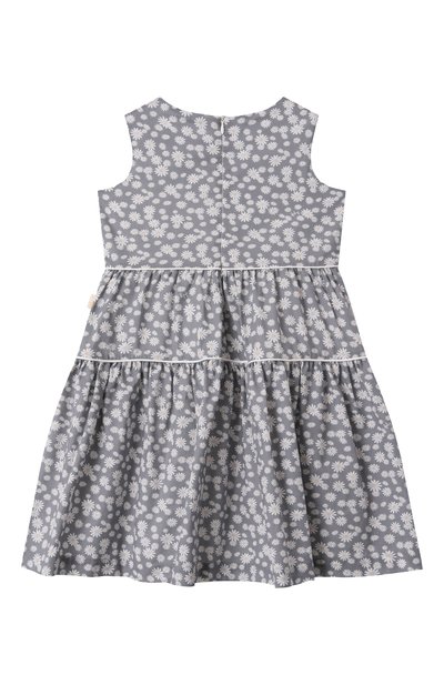 Платье с потайной молнией на спинке сшили из тонкого хлопка с цветочным принтом. Модель без рукавов, с расклешенным двухъярусным подолом дополнили однотонным дышащим подкладом.