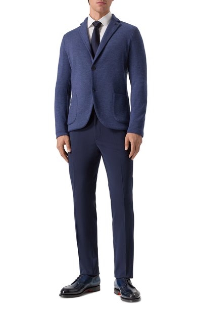 Для изготовления пиджака с внутренним прорезным и тремя внешними накладными карманами использовали микс шерсти и хлопка. Модель без подклада дополнили двумя шлицами сзади.