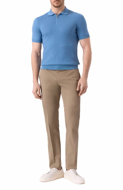 Поло пересекают шелковистые горизонтальные полосы в тон, переходящие на рукава и спинку. Модель с брендированными пуговицами сшита из хлопкового джерси. По бокам – небольшие разрезы.