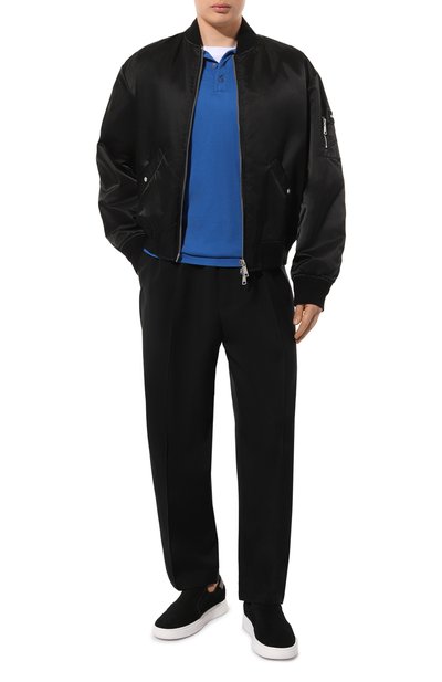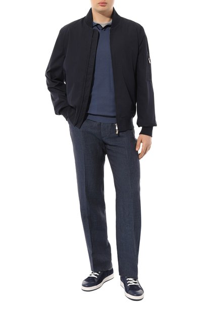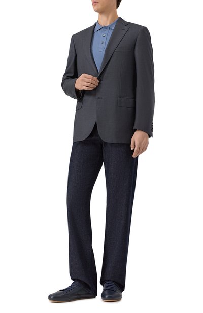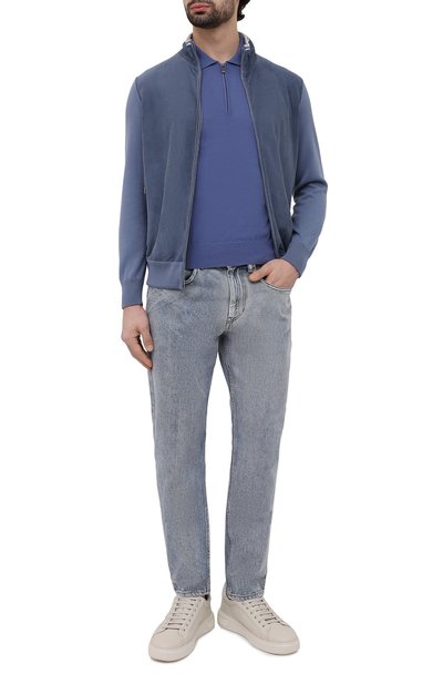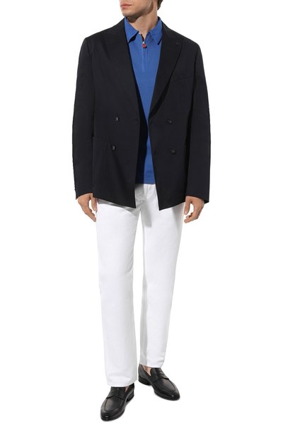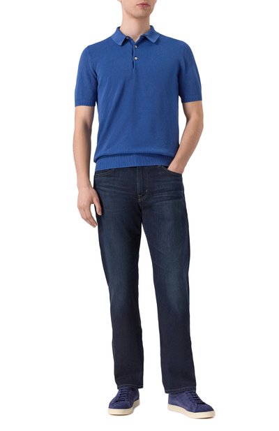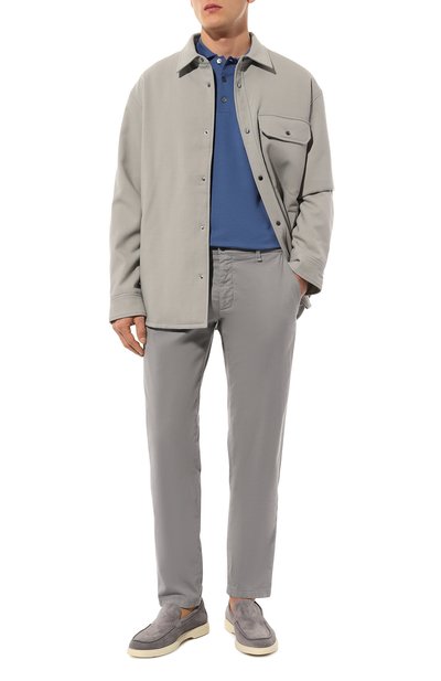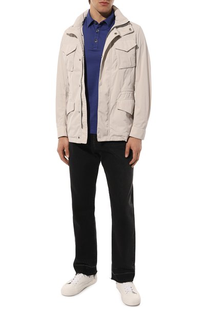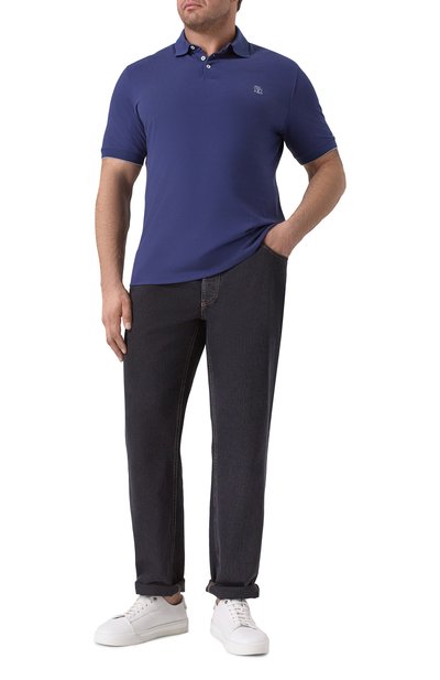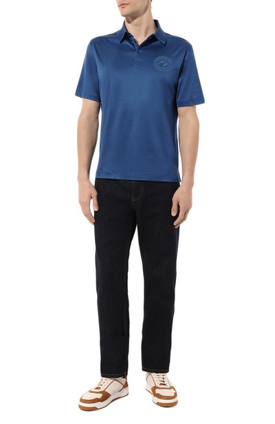 Поло с полосатым узором в тон выполнили из хлопкового трикотажа. Модель с невысокими боковыми разрезами застегивается тремя брендированными пуговицами на нагрудной планке.