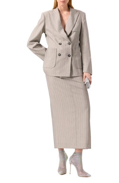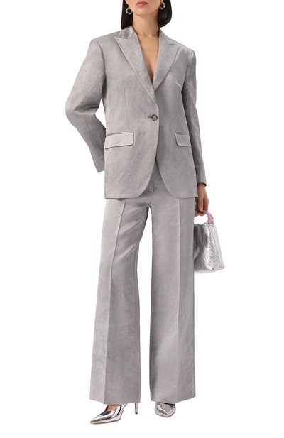 Двубортный жакет Virginia в клетку Prince of Wales сшили из микса льна, полиэстера и хлопка. Изделие с тремя карманами, остроконечными лацканами и преувеличенными плечами застегивается двумя пуговицами.