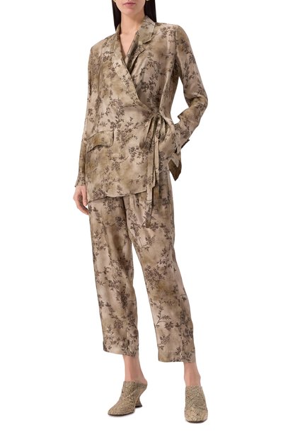 Для пошива кимоно свободного кроя использовали микс вискозы и купро с цветочным принтом. Модель с двумя накладными карманами фиксируется спереди узкими шнурами.