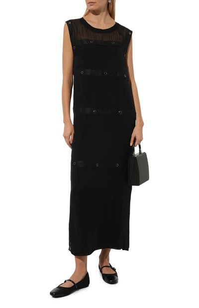 Миди-платье в рифленую полоску выполнили из вискозного трикотажа с добавлением полиэстера. Модель с волнообразной вставкой сбоку дополнили сзади контрастным логотипом бренда.