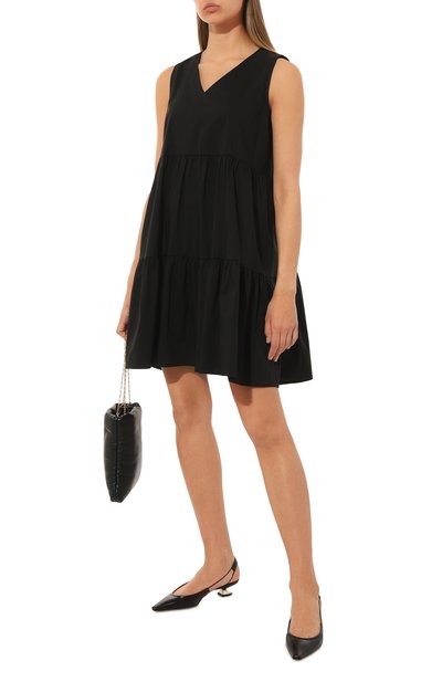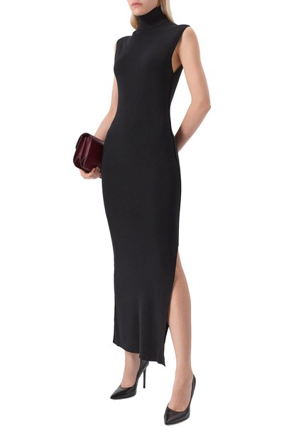 Для изготовления миди-платья с боковым разрезом использовали ребристый хлопковый трикотаж с добавлением эластана. Спереди модель украсили контрастным вышитым логотипом марки, а проймы и круглый вырез подчеркнули окантовкой разных цветов.