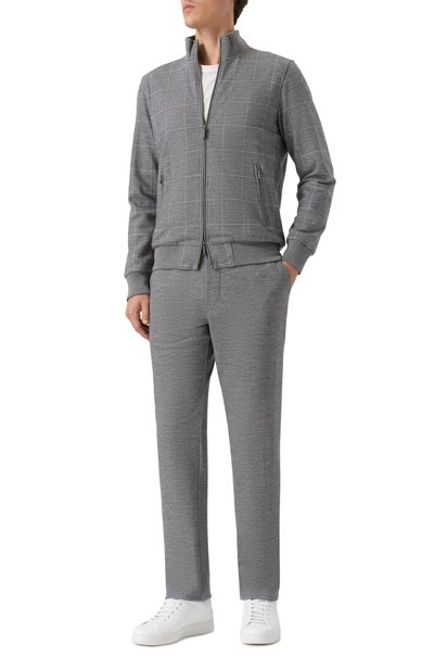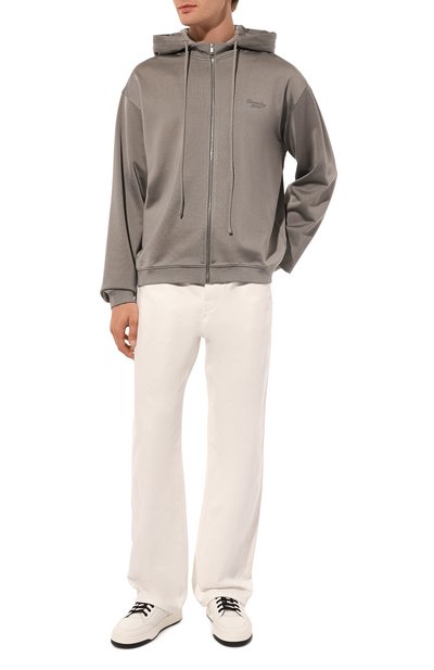 Толстовка с воротником-стойкой, манжетами и поясом из трикотажа в рубчик сшита из эластичной шерсти мериноса. Сзади изделия расположена брендированная пластина. Модель с внутренним и двумя внешними карманами застегивается встречной молнией.