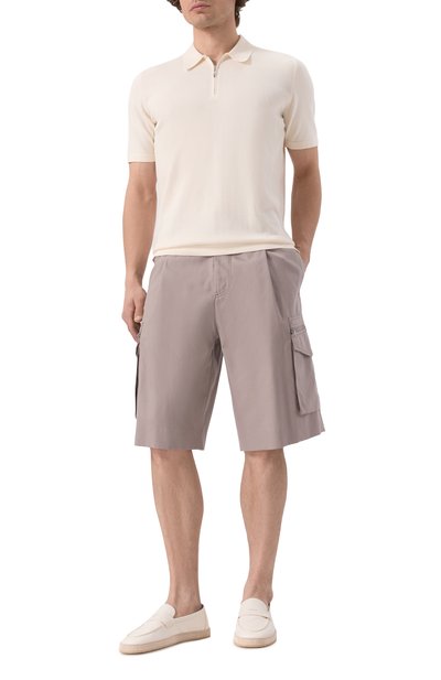 Шорты с прошитыми стрелками и контрастной вставкой на широком поясе-кулиске сшили из хлопкового трикотажа, усиленного полиамидом. Один из трех карманов (боковой) дополнили фирменной биркой.