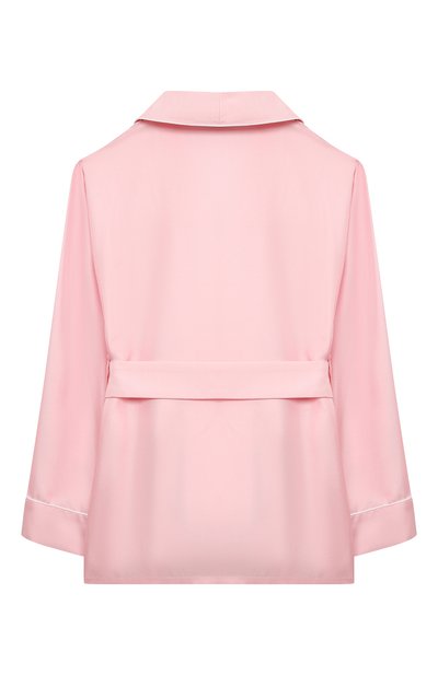 Рубашку в пижамном стиле сшили из шелкового твила с брендированным принтом и дополнили узким контрастным кантом. Модель с широкими лацканами, накладными карманами и перламутровыми пуговицами дополнили поясом-лентой.
