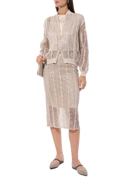 Укороченный топ из тюля украсили кристаллами, гранеными бусинами и пайетками, сформировав градиент. Модель на подкладе, напоминающем бра-бандо, застегивается молнией сзади.