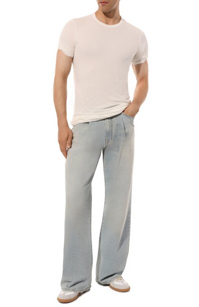 Кеды с широкой подошвой сшиты из комбинации замши и матовой кожи. Задник и язычок украшены тиснеными логотипами марки. Модель отделана внутри махровой тканью.