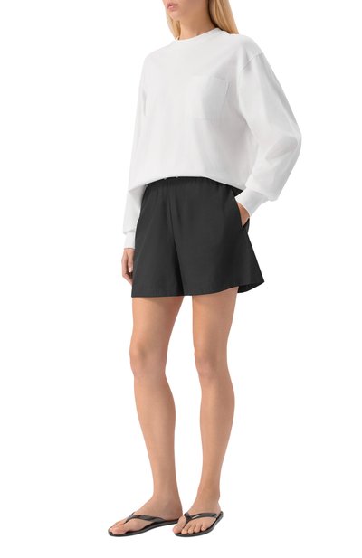 Шорты с широким эластичным поясом-кулиской и боковыми карманами выполнены из хлопкового трикотажа. Модель украсили принтом-логотипом, словно написанным фломастером.