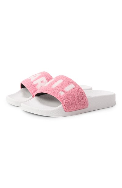Махровую союзку шлепанцев выполнили из микса полиэстера, шерсти и акрила, отделав внутри мягким текстилем. Контрастные буквы на правом и левом изделиях складываются в крупный логотип марки. Фирменная символика повторяется и на стельке.