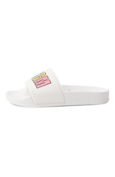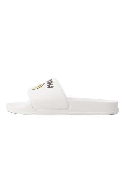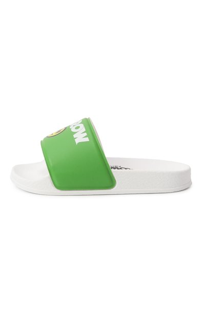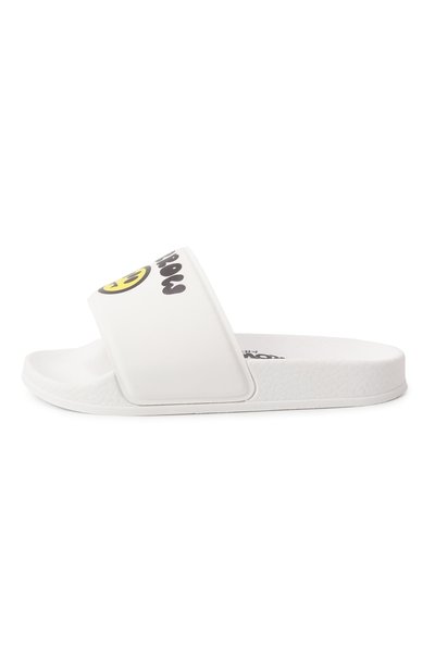 Для изготовления шлепанцев с широкой подошвой и формованной стелькой использовали полимер с разной фактурой. Перемычку с подкладкой из полиэстера украсили логотипом и эмблемой бренда.
