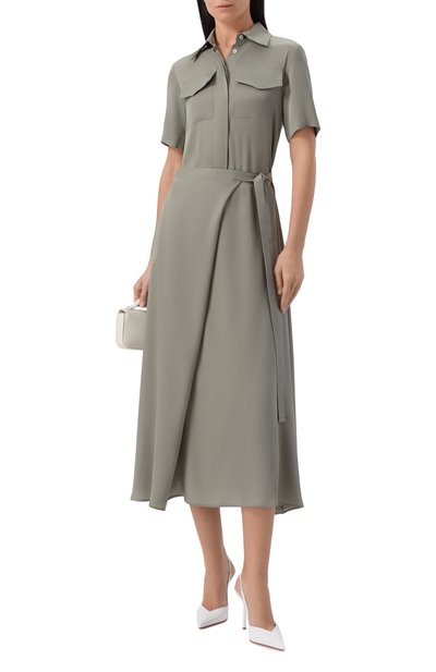 Чуть расклешенный подол платья дополнили вставкой, которая формирует крупные складки справа. С ними гармонируют струящиеся короткие рукава. Модель из кади на основе полиэстера застегивается сзади пуговицей над узким вырезом.