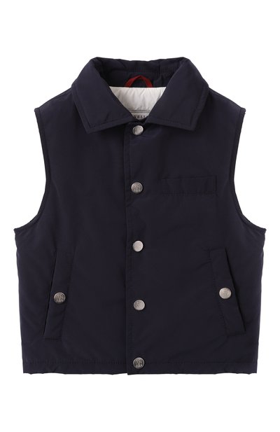 Жилет из японской водоотталкивающей микрофибры утеплили наполнителем Thermore®. Модель на кнопках украсили принтом Solomeo Surf Club сзади. Снаружи предусмотрели три кармана, а внутри — один.