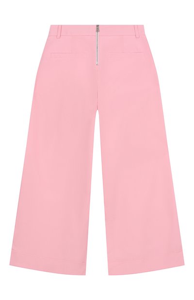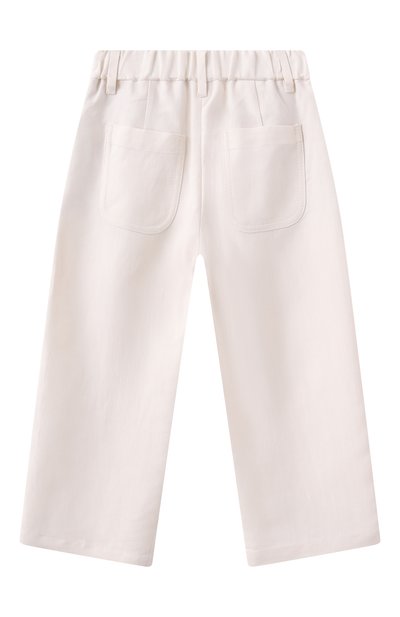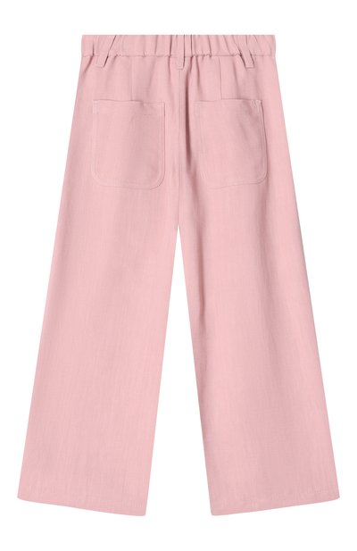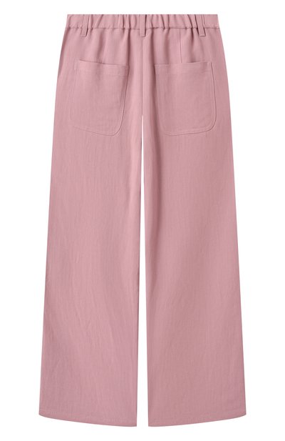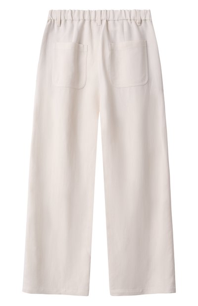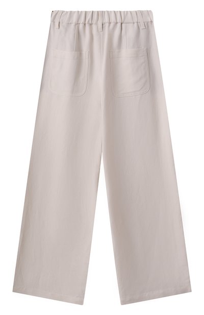 Пояс брюк со шлевками и эластичной вставкой подчеркнули петлей из цепочки мониль. Модель с защипами сшили из твила на основе вискозы и льна. Помимо боковых карманов предусмотрели накладные задние.