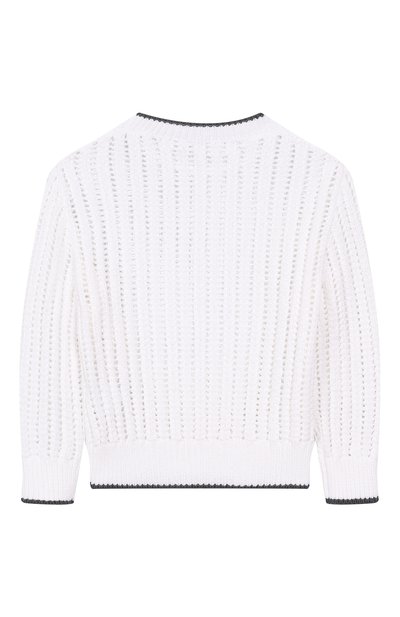 Свитер с ажурным рифленым узором дополнили контрастным кантом по краям круглой горловины, манжет и пояса в рубчик. Модель из хлопковой пряжи органично впишется в базовый гардероб.