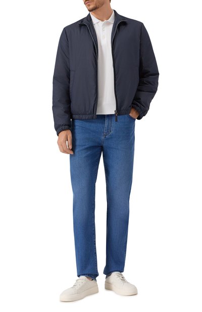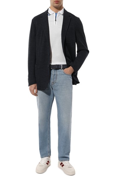 Поло с небольшими боковыми разрезами выполнили из хлопкового трикотажа. Воротник и манжеты подчеркнули полосами, а на груди разместили фирменную геральдическую эмблему Solomeo с рельефным кантом.