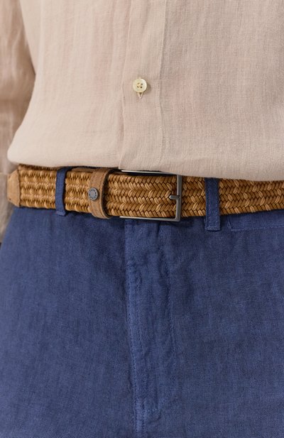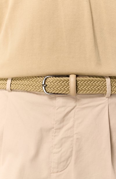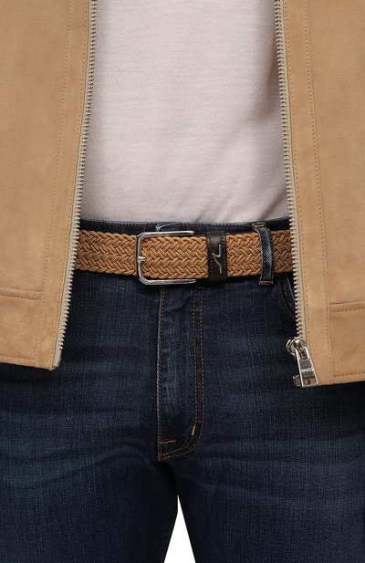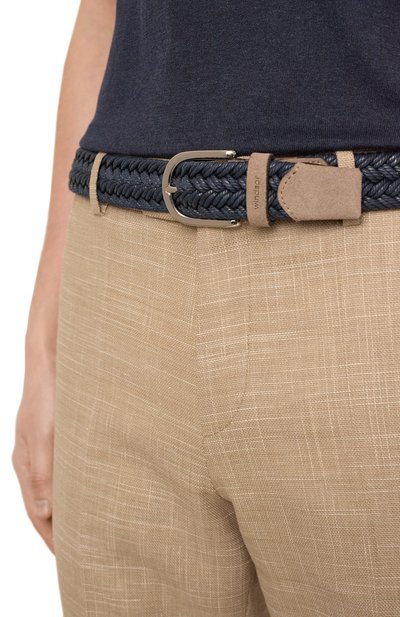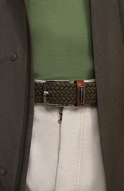 Ремень из вощеных хлопковых жгутов укрепили накладками на концах. Регулируемый аксессуар с тисненым логотипом на тренчике застегивается полукруглой пряжкой.