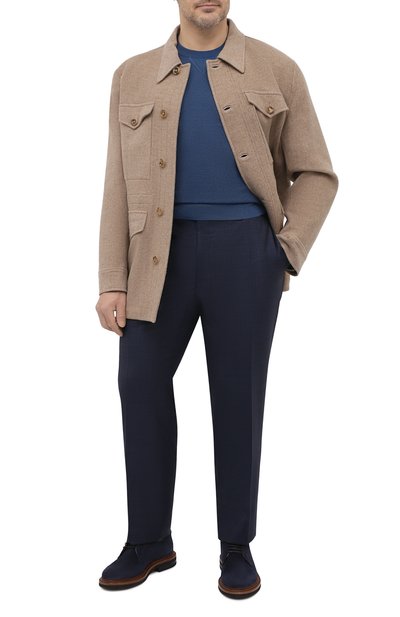 Для пошива зауженных брюк с защипами и стрелками использовали эластичную шерсть с добавлением полиамида. Модель дополнили открытыми боковыми карманами и задними с клапанами.