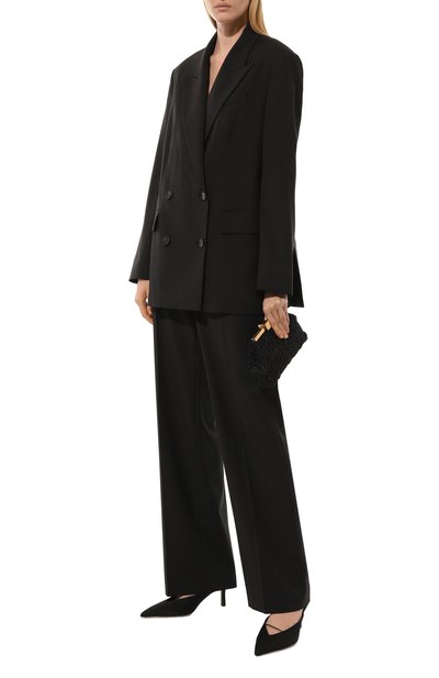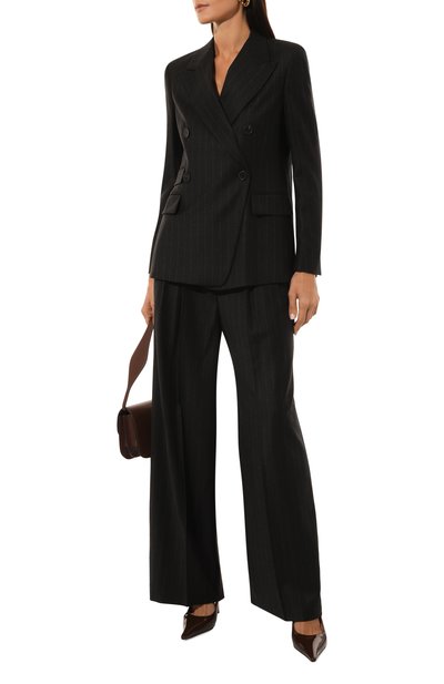 Однобортный жакет с тремя врезными карманами сшит из шерстяного габардина Estrato super 120s, произведенного старинной итальянской мануфактурой Trabaldo Togna. Приталенная модель с двумя шлицами застегивается смещенной пуговицей.