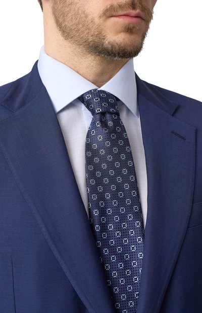 Галстук изготовили из шелкового жаккарда с рельефным узором, подчеркнутым контрастным вышитым паттерном. Аксессуар хорошо ложится в складки и не перекручивается в узле.