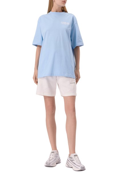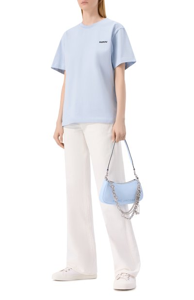 Футболку с рифленой отделкой на круглой горловине сшили из хлопкового джерси. Спереди модель украсили логотипом марки, вышитым шелковистой нитью в тон.