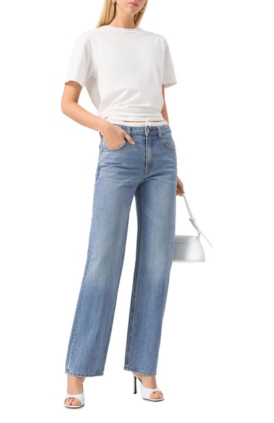 Джинсы прямого кроя сшили из хлопкового денима с заломами. Самый маленький из пяти карманов украсили брендированной нашивкой, а задний дополнили фирменной многослойной пластиной. Модель представлена эксклюзивно в ЦУМе.