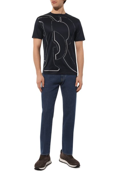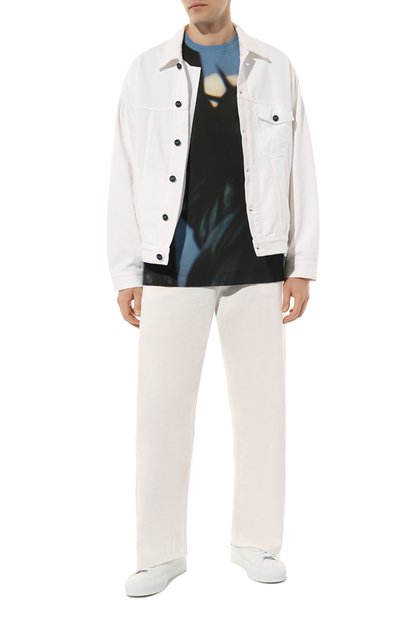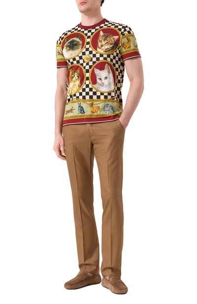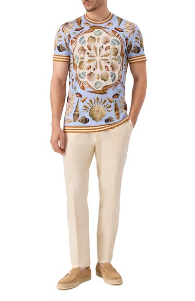 Футболка с красочным принтом может стать акцентом в повседневном образе. Для пошива модели с круглой горловиной использовали гладкий хлопковый трикотаж.