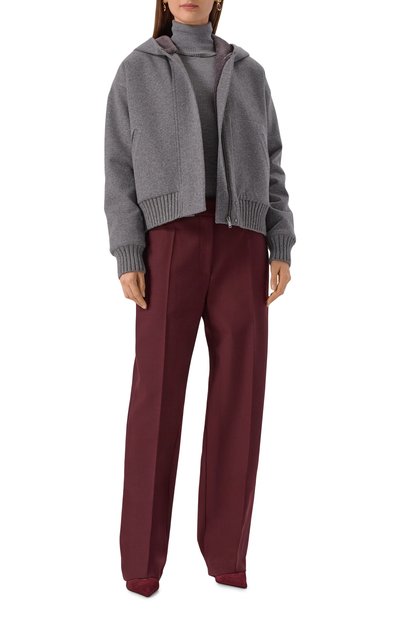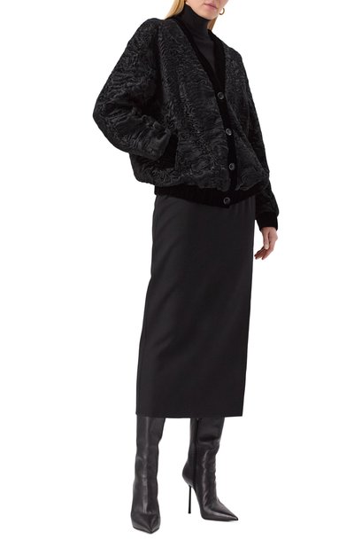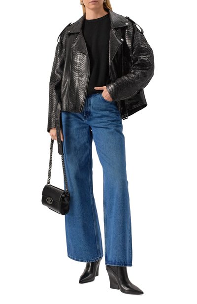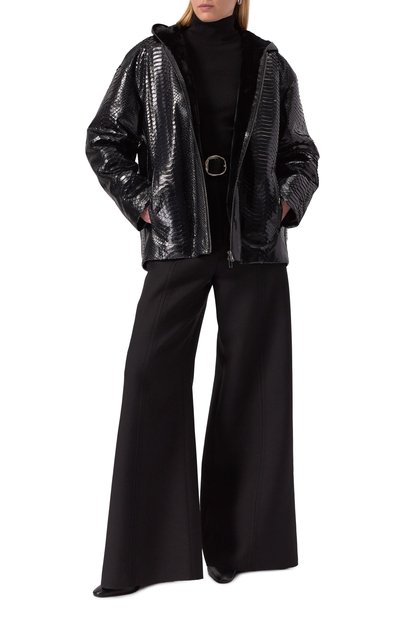 Свободную куртку с капюшоном и двумя карманами сшили из глянцевой кожи питона, окрашенной в черный цвет. Модель с шелковым подкладом застегивается встречной молнией.
