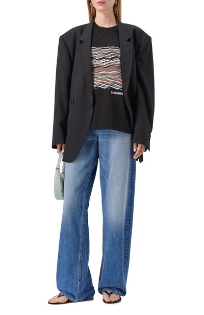 Футболку из стрейчевого хлопкового джерси украсили ярким брендированным принтом, вдохновленным британскими лугами. Модель органично впишется и в образ total black, и в комплект с контрастными вещами.