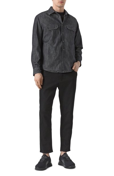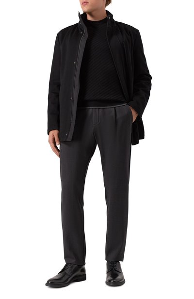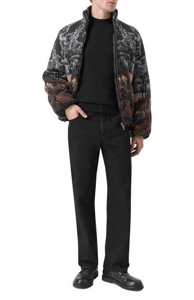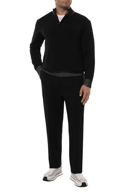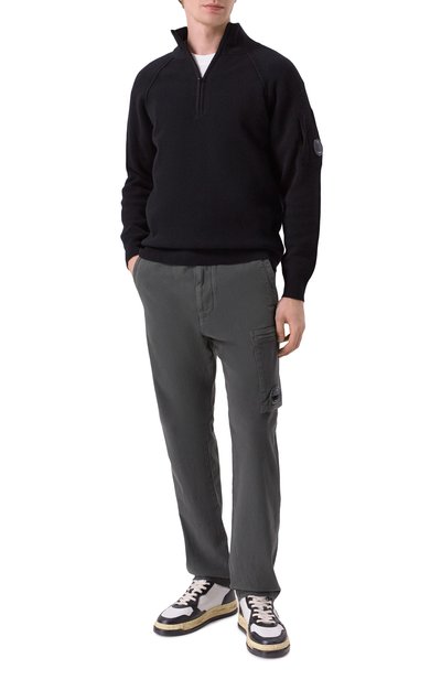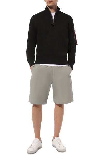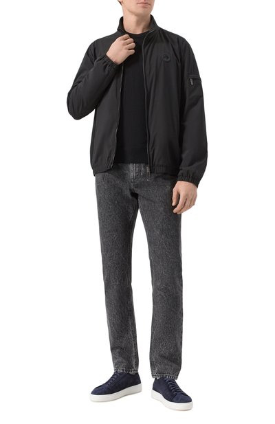 Джемпер с рифленой отделкой выполнили из трикотажа плотностью 14 петель на дюйм, связанного из длинноволокнистого хлопка Sea Island. Модель с высоким воротом на молнии и линией реглан, подчеркнутой рельефными швами, дополнили нарукавным карманом с фирменной линзой.