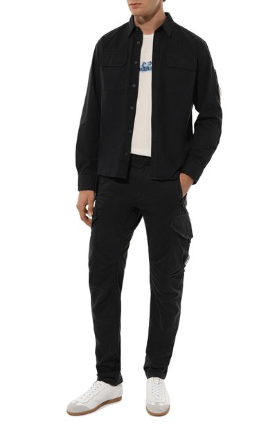 Брюки с защипами в области колен дополнили боковыми, задними прорезными карманами и карго с клапанами, один из которых украсили фирменной линзой. Модель силуэта Ergonomic fit сшили из эластичного хлопкового твила.