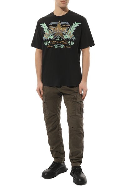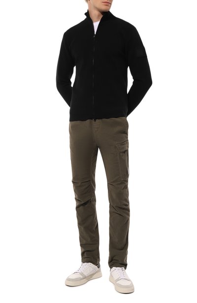 Брюки кроя Ergonomic fit, с потайной кулиской на поясе и вытачками на коленях сшили из стрейчевого хлопка. Окрашенную в готовом виде модель с четырьмя карманами дополнили парой карго с клапанами, один из которых украсили фирменной линзой.