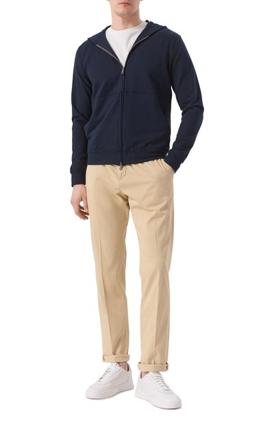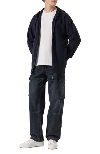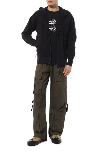 Толстовку с манжетами-митенками и боковыми прорезными карманами на молниях изготовили из хлопкового футера. Регулируемый капюшон украсили фирменными линзами Goggle.