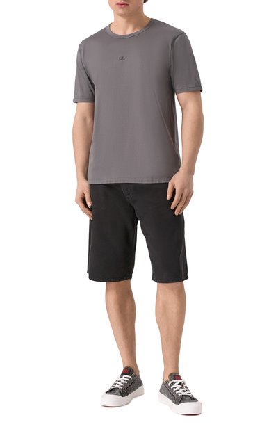 Футболку украсили спереди принтом British Sailor, который многократно продублировали сзади, дополнив этикеткой с описанием процесса нанесения рисунка. Модель сшили из хлопкового джерси.