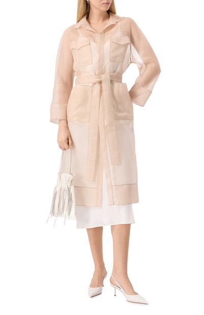 Пальто с запахом, поясом-лентой и четырьмя накладными карманами сшито из полупрозрачного шелка. Легкая модель прямого кроя гармонично сочетается как с дневным, так и с вечерним нарядом.