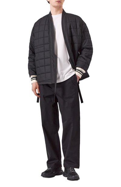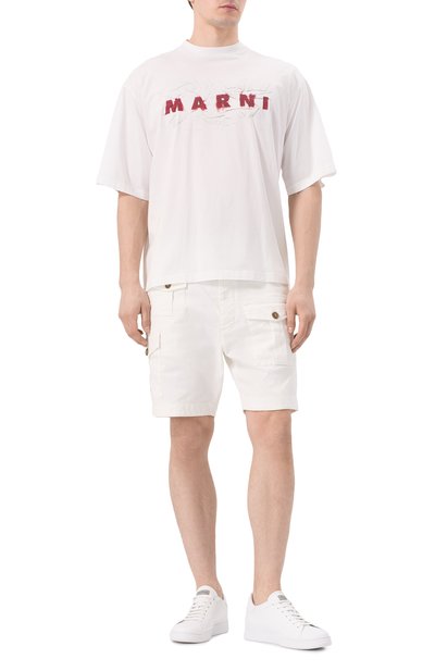 Для изготовления свободной футболки со спущенной линией плеч использовали хлопковое джерси. Модель дополнили трикотажным нагрудным карманом, который будто частично скрыли под асимметричной деталью.