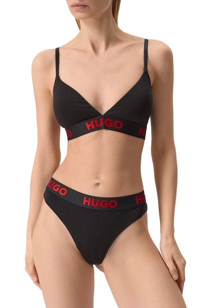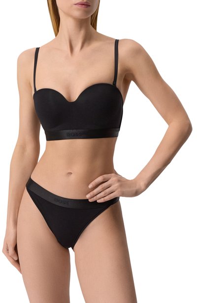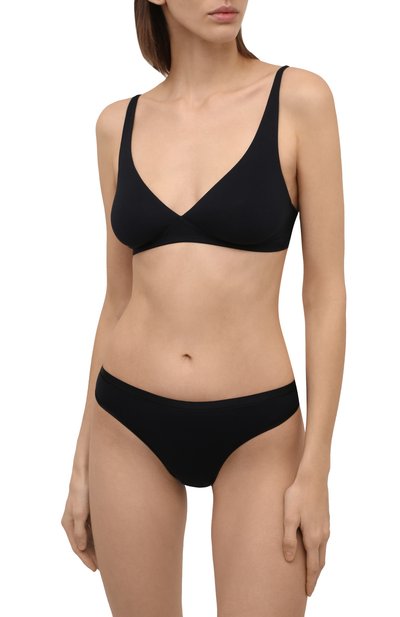 Бюстгальтер с формованными треугольными чашечками выполнили из вискозного джерси стрейч. Посадку можно регулировать брендированными бретелями со слайдерами и поясом с двумя крючками и четырьмя вариантами объема.