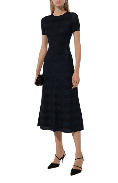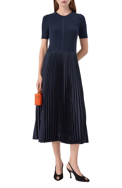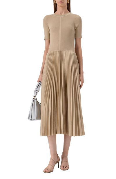 Платье Fadridi напоминает комплект из пуловера и плиссированной юбки. Лиф с акцентной полосой спереди выполнили из рифленого вискозного трикотажа с добавлением нейлона, а подол изготовили из полиэстера.