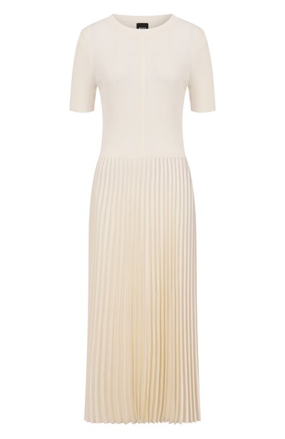 Платье Fadridi напоминает комплект из пуловера и плиссированной юбки. Лиф с акцентной полосой спереди выполнили из рифленого вискозного трикотажа с добавлением нейлона, а подол изготовили из полиэстера.